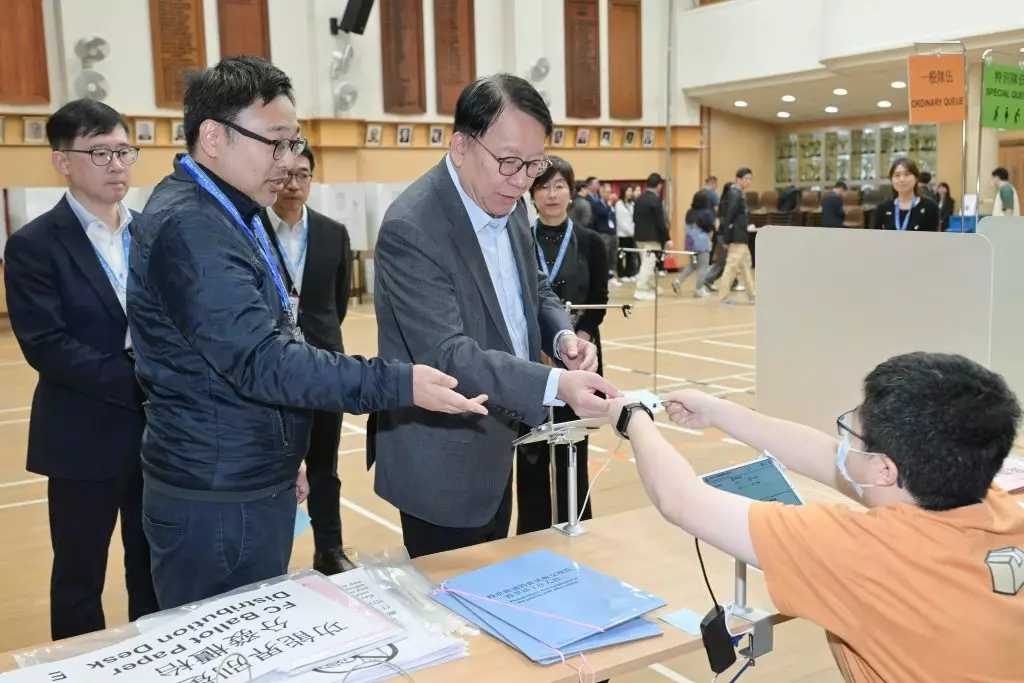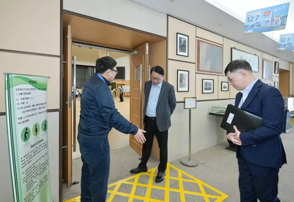 在選民投票後,票站職員會派發心意卡表達謝意。陳國基呼籲選民在星期天的投票日積極投票,「早投早安心」,選出有抱負、有承擔、有能力的新一屆立法會議員,與政府攜手努力,做好火災善後重建復常的工作,以及推動經濟民生發展,一起共創未來。