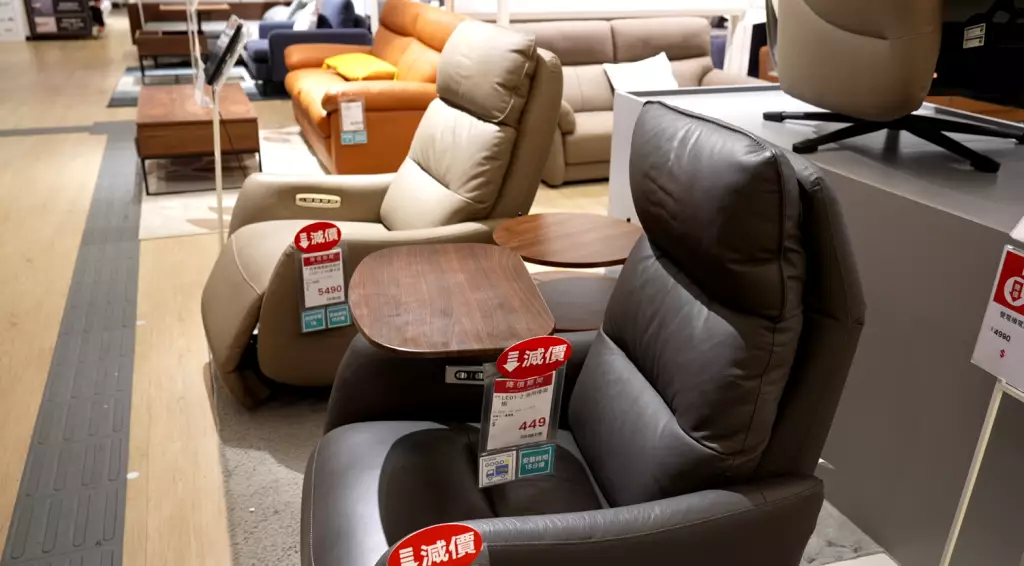 NITORI的梳化以「小巧尺寸」和「高性價比」打入香港市場。有單人梳化設計四個摩打,可以調整喜歡的坐姿,全方位照顧頭、腰和腳;另一款銷量較好的是兩人位梳化斯坦恩,安裝簡便,僅需組裝扶手即可,性價比高,每家店鋪每周售出約5套。