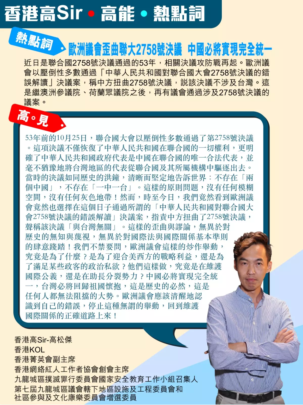高Sir:53年前的10月25日,聯合國大會以壓倒性多數通過了第2758號決議。這項決議不僅恢復了中華人民共和國在聯合國的一切權利,更明確了中華人民共和國政府代表是中國在聯合國的唯一合法代表,並毫不猶豫地將台灣地區的代表從聯合國及其所屬機構中驅逐出去。當時的決議如同歷史的洪鐘,清晰而堅定地告訴世界:不存在「兩個中國」,不存在「一中一台」。這樣的原則問題,沒有任何模糊空間,沒有任何灰色地帶!然而,時至今日,我們竟然看到歐洲議會竟然也選擇在這個日子通過所謂的「中華人民共和國對聯合國大會2758號決議的錯誤解讀」決議案,指責中方扭曲了2758號決議,聲稱該決議「與台灣無關」。這樣的歪曲與謬論,無異於對歷史的無知與蔑視,無異於對國際法與國際關係基本準則的肆意踐踏!我們不禁要問,歐洲議會這樣的炒作舉動,究竟是為了什麼?是為了迎合美西方的戰略利益,還是為了滿足某些政客的政治私欲?他們這樣做,究竟是在維護國際公義,還是在助長分裂勢力?中國必將實現完全統一,台灣必將回歸祖國懷抱,這是歷史的必然,這是任何人都無法阻擋的大勢。歐洲議會應該清醒地認識到自己的錯誤,停止這種無謂的舉動,回到維護國際關係的正確道路上來!