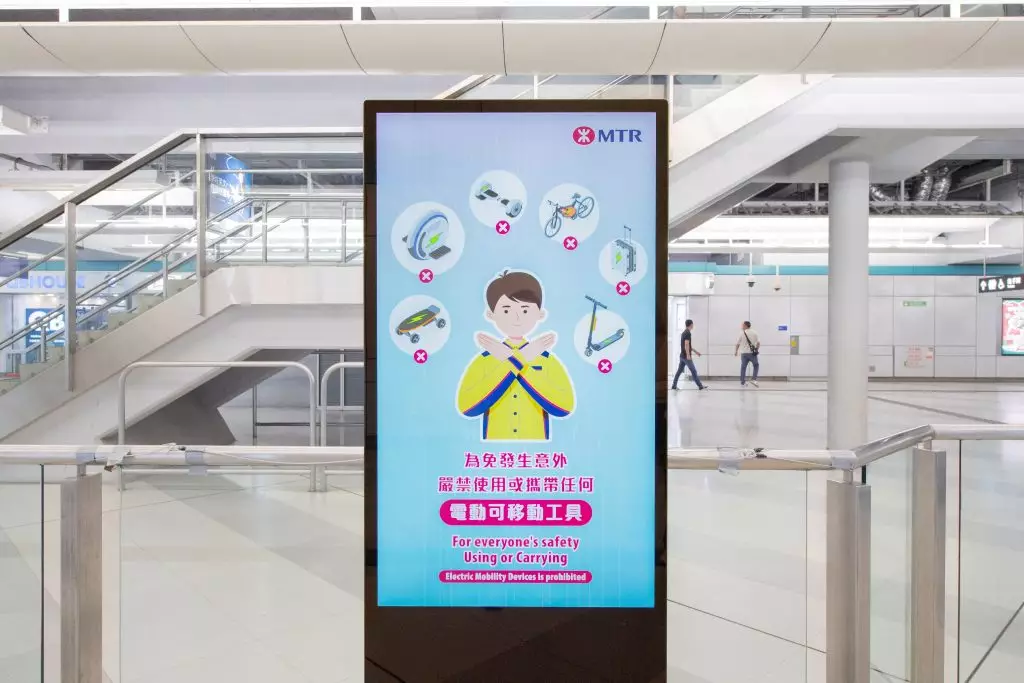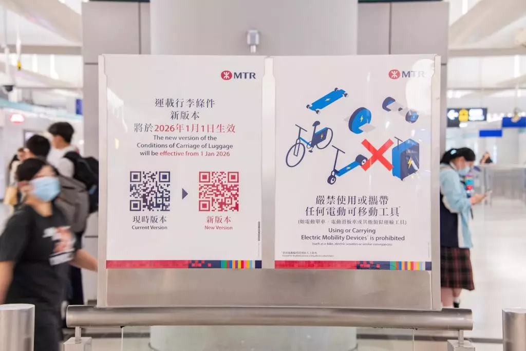 港鐵站及輕鐵車站會張貼新告示,讓乘客了解由2026年1月1日起,禁止攜帶電動可移動工具進入港鐵範圍的新規定。