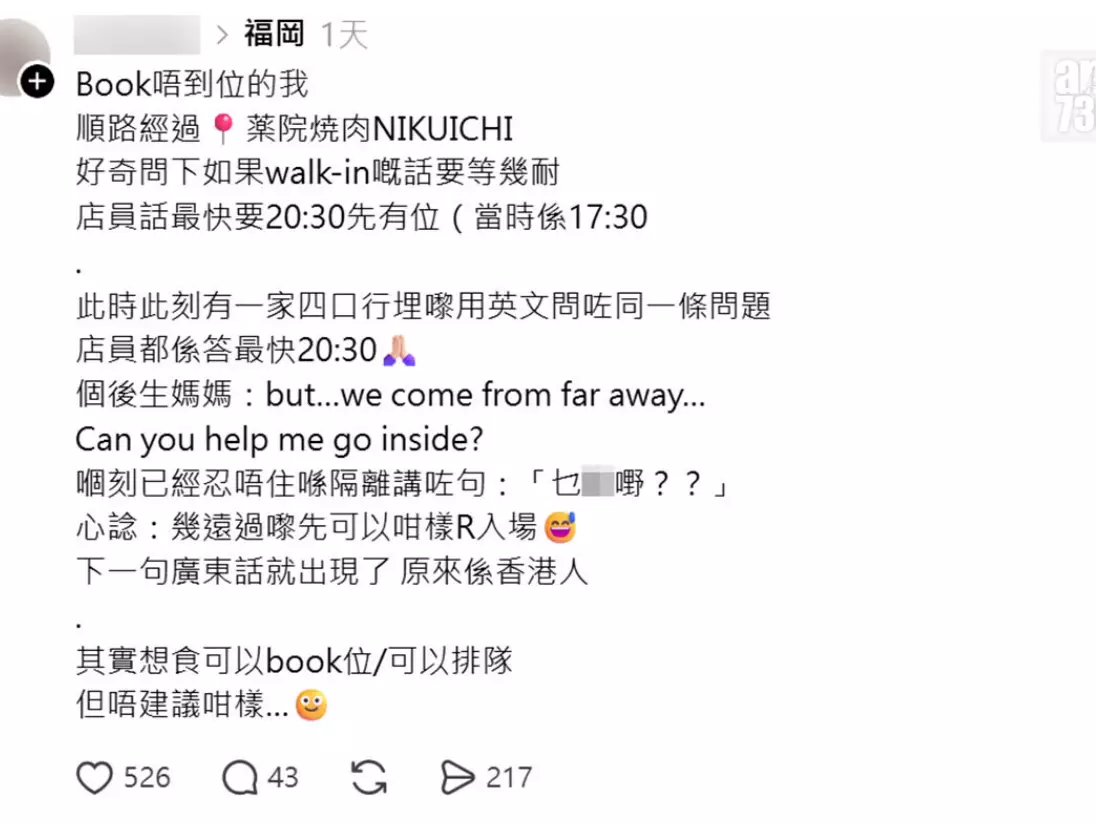 有港人日前在社交平台發文,指早前想預約日本福岡縣的人氣燒肉店「薬院焼肉NIKUICHI」,但不成功,其後到了當地路經該店,於是詢問店員如沒預約要等候多久,豈料要3小時之久。而當時有一家四口站在她的旁邊,其中媽媽得知要等3 小時後,即指他們一家人來自很遠的地方,可否安排他們進內 (but we come from far away, can you help me go inside?)。