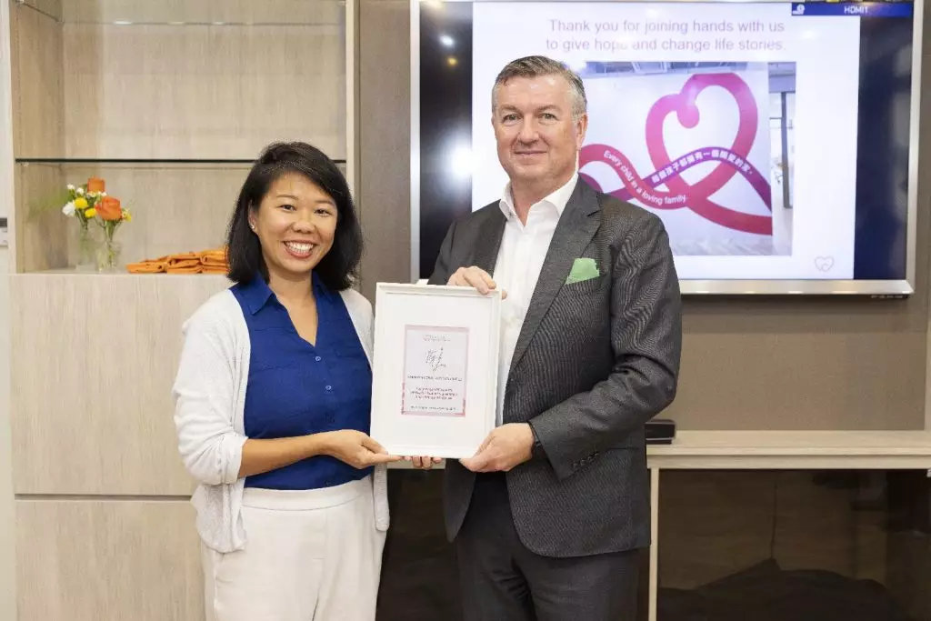 「母親的抉擇」行政總裁蕭加欣向金門建築總裁歐嘉榮贈予感謝狀。