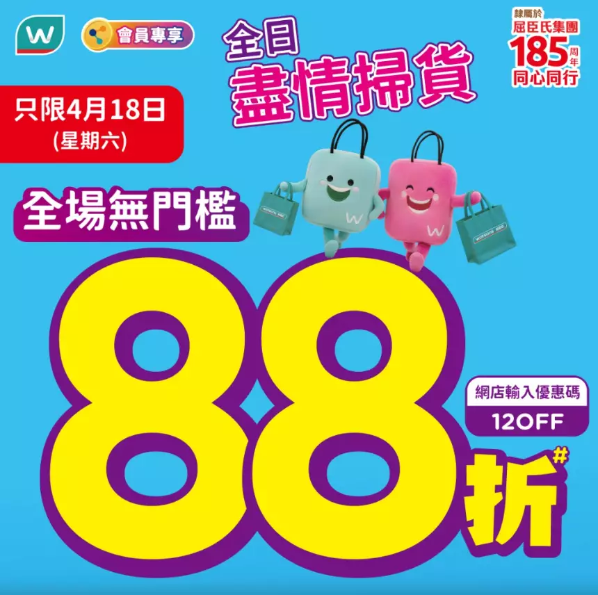 - 屈臣氏(4月18日):會員全場無門檻88折(網店碼「12OFF」);門市購物送券,疊加信用卡及支付優惠。