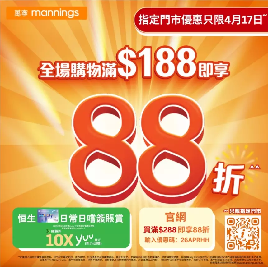 - 萬寧(4月17日):門市滿$188享88折;網店滿$288輸入優惠碼「26APRHH」享88折。