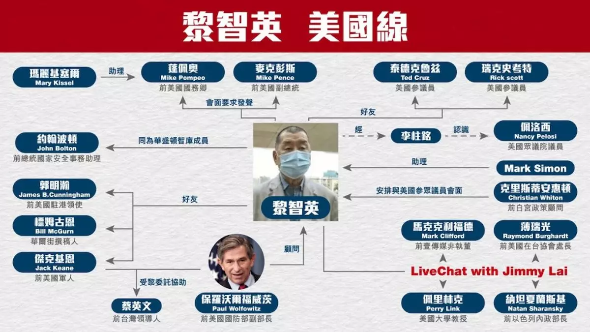 黎又確認,當時亦曾與時任國務卿蓬佩奧會面,向對方提及香港社運,希望對方為港發聲及支持香港。 黎又承認與時任時任國家安全顧問博爾頓(John Bolton)有聯繫,對方訪台時曾會面。至於時任美國眾議院議長佩洛西,曾透過李柱銘與佩洛西會面。 黎稱,Mark Simon曾聘請時任美國國安安顧問惠頓(Christian Whiton),以協助接觸國會議員。