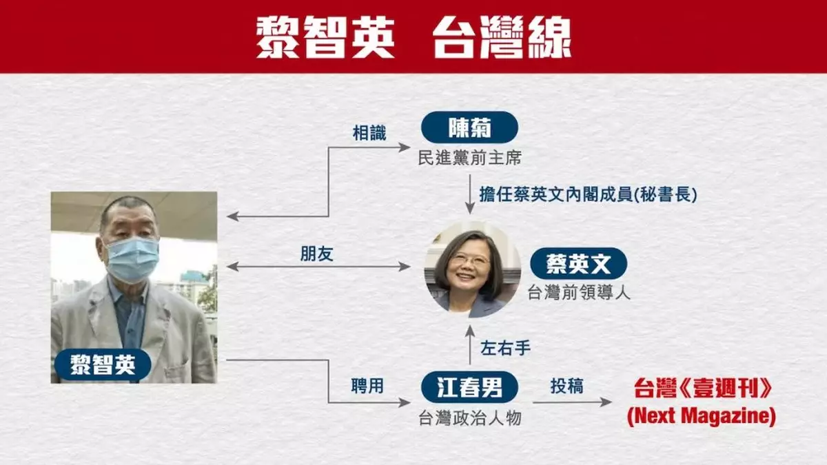 至於跟台灣政治人物的聯繫。黎指,他到台灣創辦《壹週刊》時,透過一場活動認識尚未成為台灣領導人蔡英文;及至蔡成為領導人後,透過台灣《壹週刊》前作者、曾是蔡「左右手」的江春男,跟蔡見面數次,但形容兩人對話內容「沒什麼特別」,只屬客套性質。