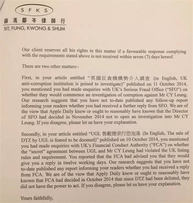 另外,梁振英向《蘋果日報》發出律師信又指出,《蘋果日報》在2 014年10月10日一篇以「UGL售戴德梁行恐泡湯」 為標題的報道,指《蘋果日報》 此報道提過曾向英國金融市場行為監管局(FCA)查詢,UGL和 梁振英的「機密」交易有否違反英國上市規例。《蘋果日報》 的報道指英國金融市場行為監管局當時話會在12日內答覆。 律師信指出,據他們的研究顯示,《蘋果日報》 其後並沒有跟進報道告訴讀者,《蘋果日報》 曾否收到英國金融市場行為監管局的回覆。律師信指他們認為《 蘋果日報》知道,或者其實應該知道,英國金融市場行為監管局在2 014年10月已經決定它沒有權力展開調查,因為相關的DTZ公 司已撤消在英國上市。