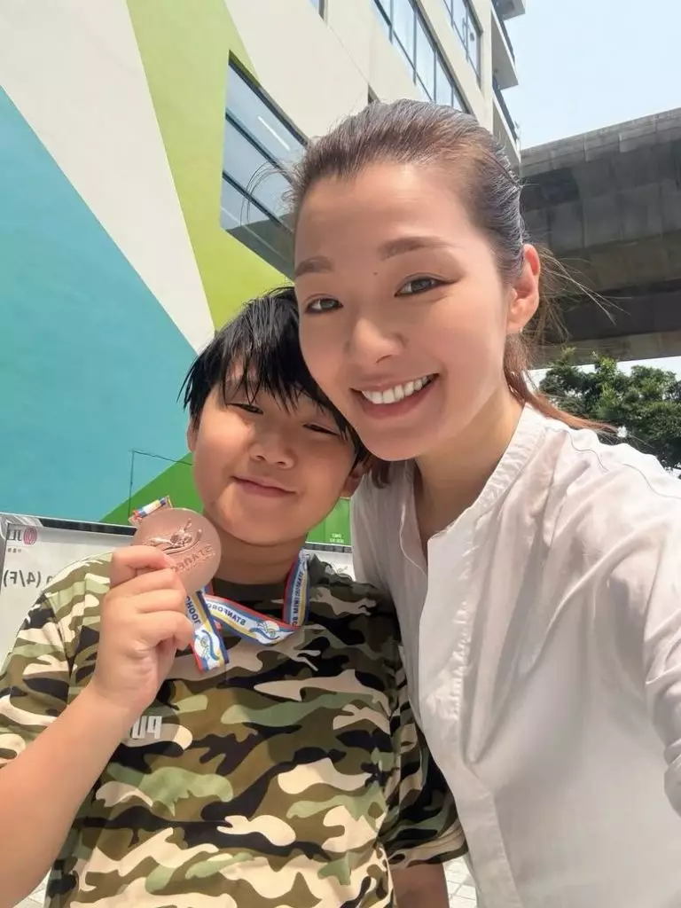 她透露比賽前夕蟹籽擔心成績,她安慰兒子:「從來參加比賽都係用嚟check吓自己個水平去到邊度,係用嚟挑戰自己,獎唔獎牌都係bonus。」奪獎後她搞笑對蟹籽說:「游完水咁攰,不如返屋企打機算啦!我好想食薯條同打機啊!」兩母子溫馨慶祝佳績。