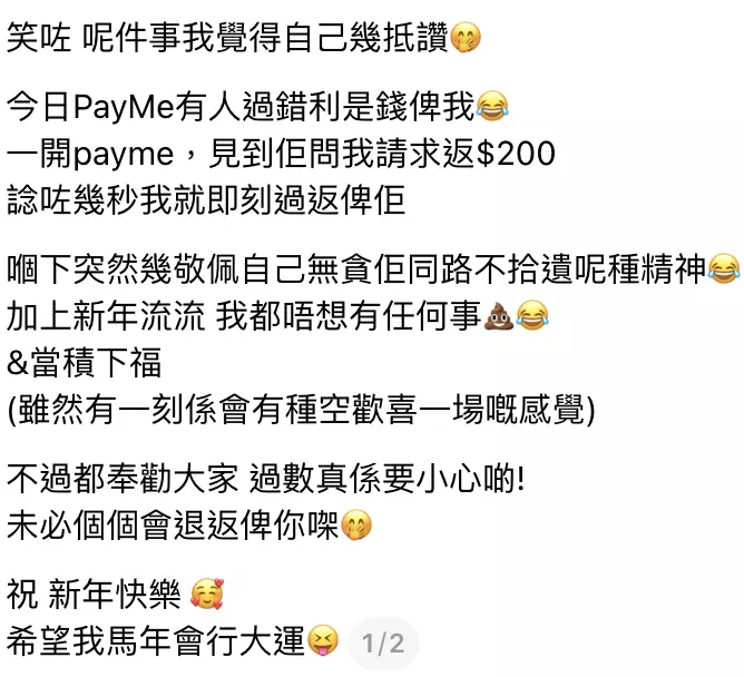 港女年初三收陌生PayMe利是200元,對方稱誤轉要求退返,她照做自詡「路不拾遺」。網民憂洗黑錢風險,籲直接拒收或通知銀行處理。