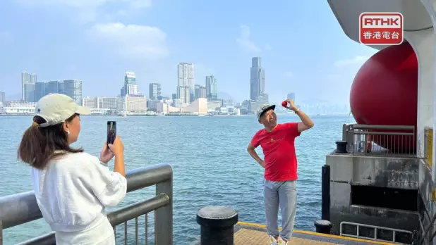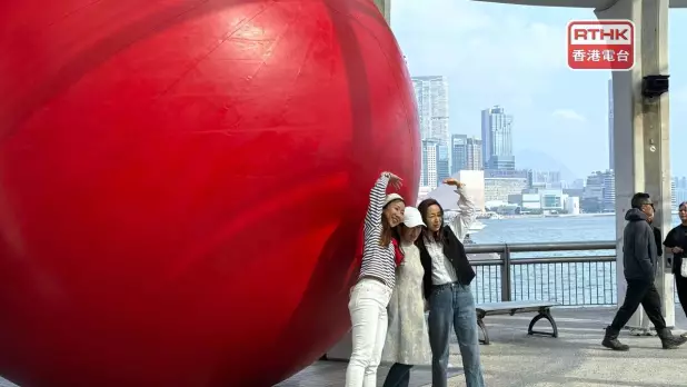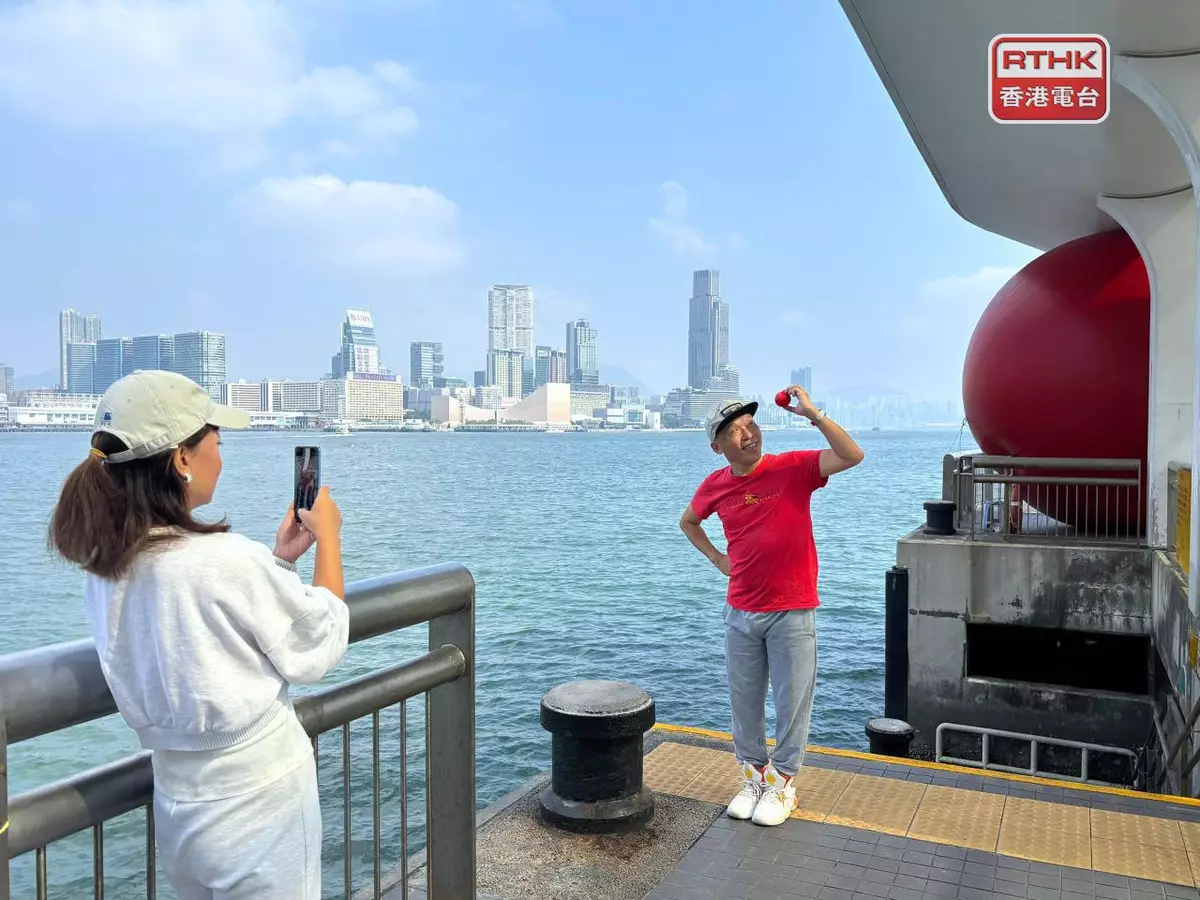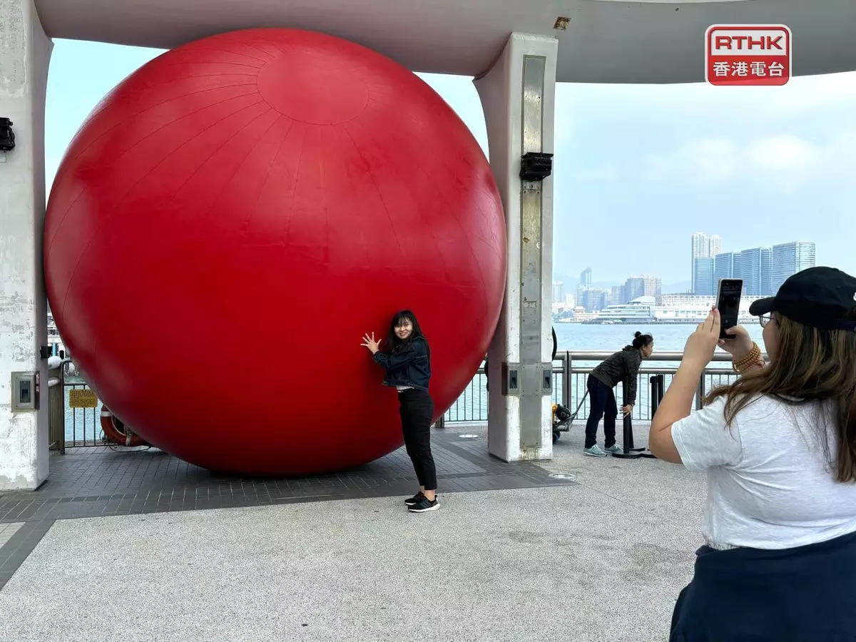 大型藝術品「紅球」在中環10號碼頭展出,放置於碼頭沿海的欄杆中間,不少市民到場參觀及拍照。「紅球」於即日起至本月15日,在香港的10個不同地點巡展,為期10天,展覽免費開放。