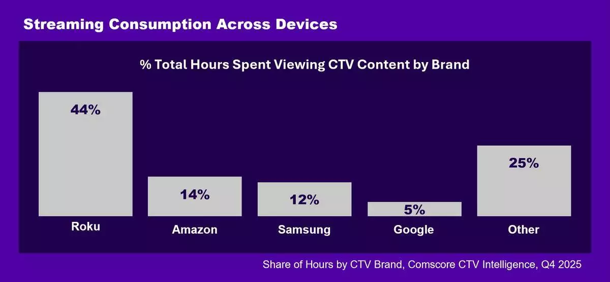 據Comscore數據顯示,Roku在美國的參與度是次要領先電視作業系統的三倍以上,突顯Roku主頁在人們串流觀看方式中的規模和重要性。