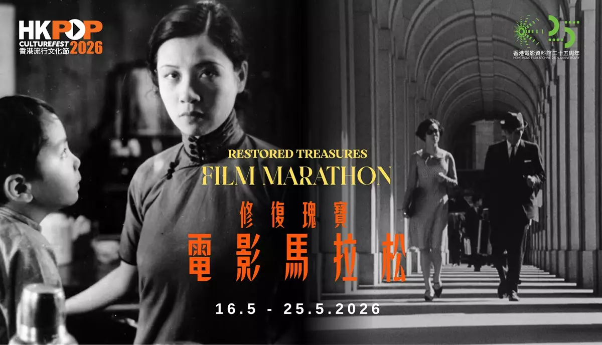 康樂及文化事務署(康文署)香港電影資料館(資料館)推出放映節目「修復瑰寶 - 電影馬拉松」,5月16至17日(星期六、日)一連兩天,在東九文化中心劇院放映五部經數碼修復的影壇經典,帶領觀眾穿越百年光影長河,感受電影的永恆魅力。電影門票一律為70元,現已於城市售票網(www.urbtix.hk)公開發售,電話購票請致電3166 1288。康文署博物館通行證持有人於城市售票網售票處購買此節目正價門票,可獲八折優惠。凡購買此放映節目任何兩張或以上正價門票,亦可獲八折優惠。節目為資料館25周年誌慶及「香港流行文化節2026」節目之一。
