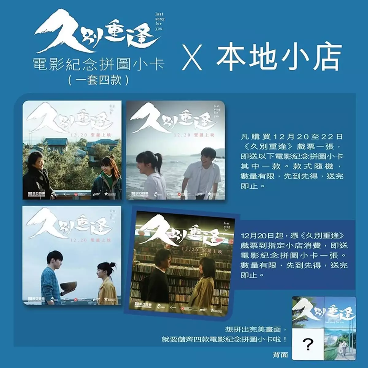 同時,電影公司於開畫日起悉心聯乘十間社區小店,推出「電影紀念拼圖」,觀眾憑《久別重逢》開畫日起戲票,有機會得到主要角色劇照及插畫所設計之「電影紀念拼圖」,並到指定合作小店享受有關優惠。有關活動旨在連結香港電影和社區個性小店,寄望互相帶動並促進不同文化的交流。