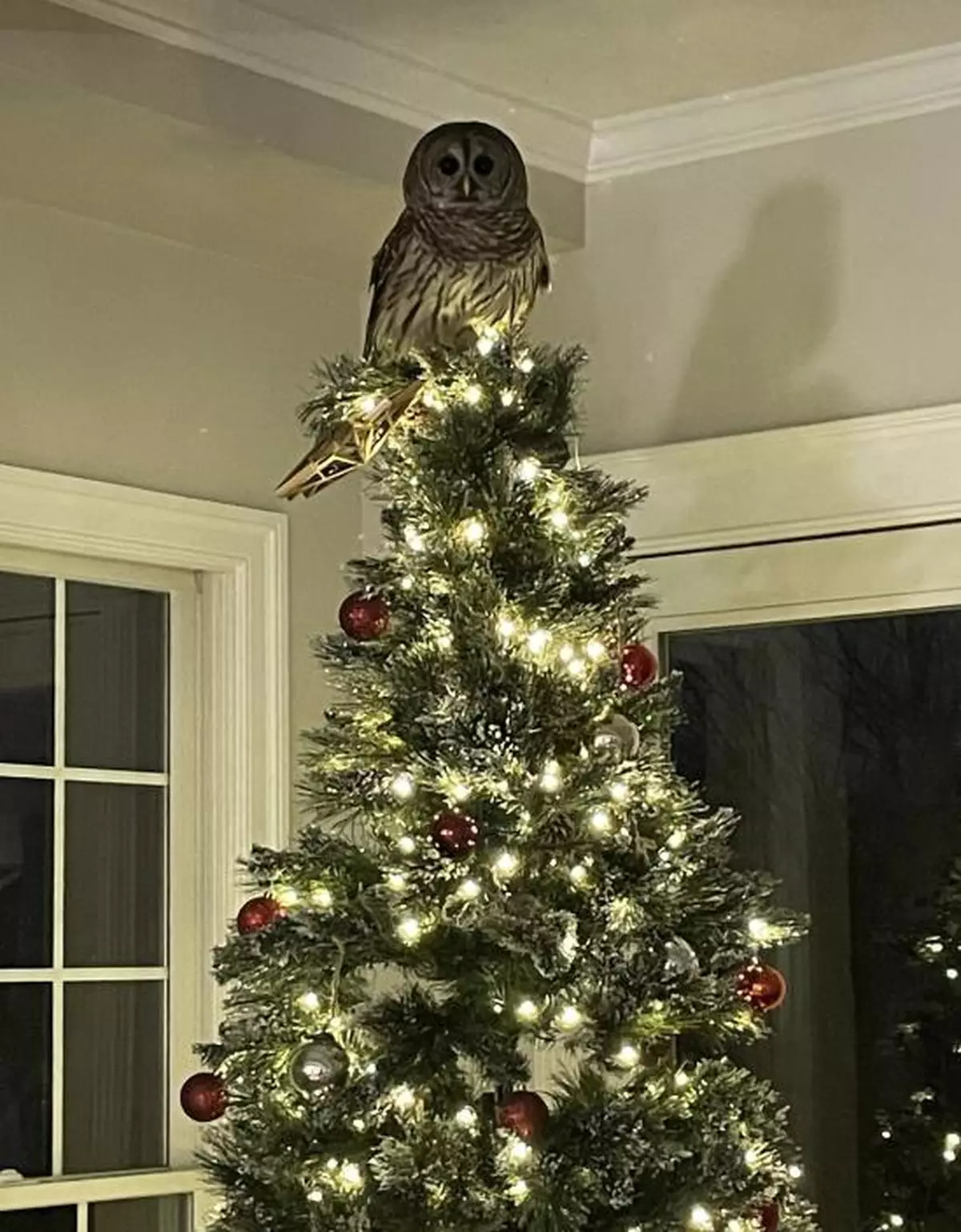 仔細一看,牠是一隻斑紋貓頭鷹,進佔聖誕樹頂時,先弄掉金色星星,為自己騰出空間,然後若無其事站著。主人連忙致電阿靈頓動物福利聯盟求助,也不忘拍下照片留念。
