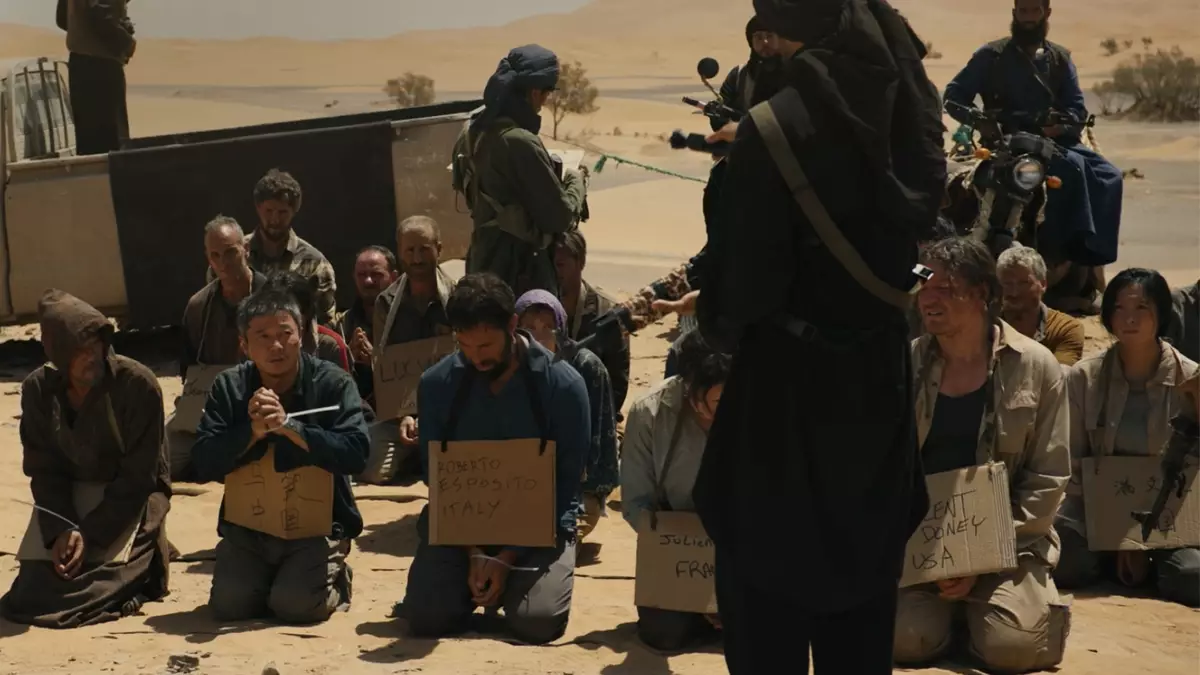 從預告中亦看到電影揭示了鮮為人見的境外戰亂地帶,四周遍佈炸彈、暴行無處不在,槍決火刑、砍腳割喉、無差別屠殺、自殺式襲擊...... 文明世界的一切在這裡毫無「用武之地」。戲中主角們被意外捲入這場「鋼鐵軍」掀起的暴亂之中,淪為了明碼標價的人質,一條人命贖金五百萬美金。死亡如影隨形,為抓住一線生機,戲中一眾角色展開了一場驚心動魄的極限自救。電影一方面向觀眾披露了在世界的另一端依舊充斥著血腥殘酷的暴行,同時也呈現了生活在這片戰亂之地的普通人面對著怎樣提心吊膽、生死無常的生活。炮火背後是無數無辜的家庭,面對戰火硝煙,和平永遠是全人類共同的期待。