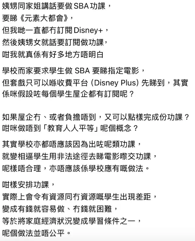 樓主表示,姨甥女因學校SBA功課需觀看《元素大都會》,但家中並無訂閱Disney+,校方亦未提供其他觀看途徑。她質疑:「係咪假設咗每個學生屋企都有訂閱呢?如果屋企冇、或者負擔唔到,又可以點樣完成份功課?」