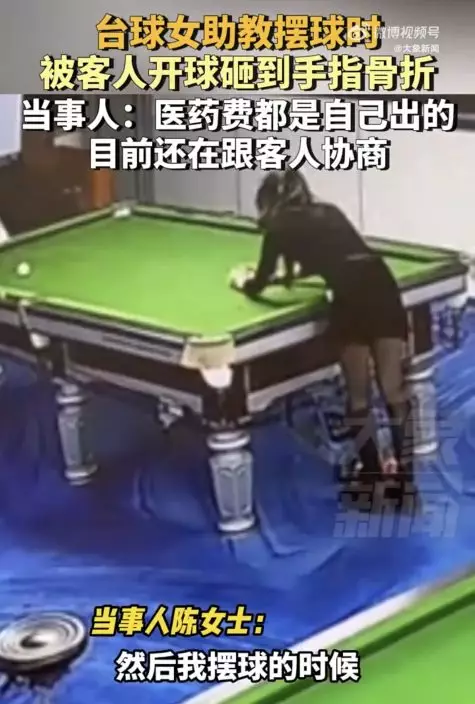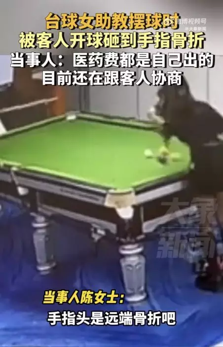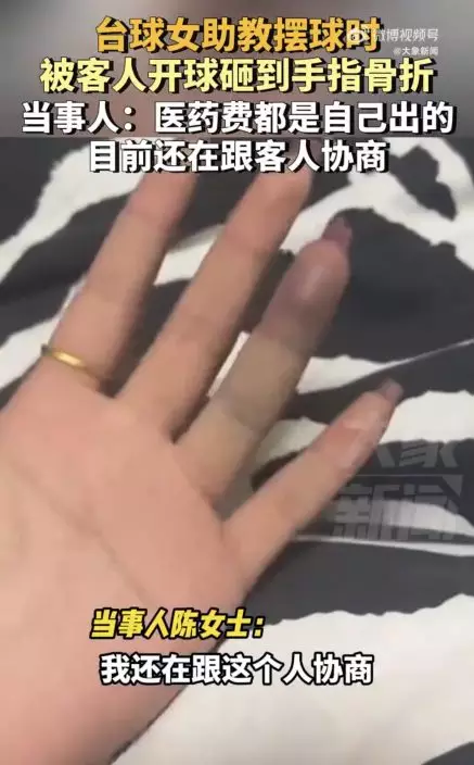 影片可見,身材姣好穿著黑絲馬丁靴的陳女士正在擺球時,客人就作勢準備開球。疑因桌球沒有擺正,陳女士見狀再次伸手調整,結果客人已經將母球擊出,只見母球高速飛出並擊中陳女士的左手無名指,導致手指骨頭嚴重裂開。