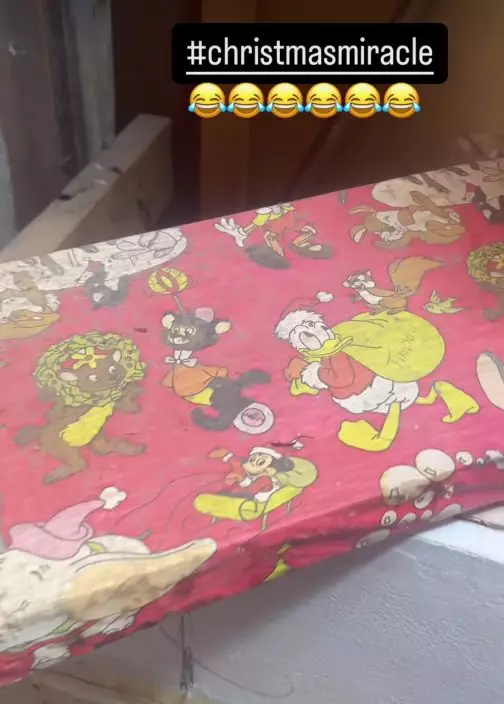 提姆表示,當時自己正在裝修浴室,砌牆前決定檢查牆內空間以確保無遺漏,結果意外地發現了這份塵封多年的聖誕禮物。影片可見,提姆在牆後找到一個包裹著許多卡通人物包裝紙的聖誕禮物,由於被隱藏多年,上面覆蓋了一片灰塵。此外,這份禮物上面還寫有他的名字。