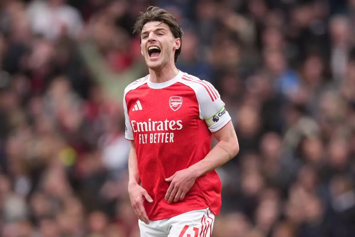 阿仙奴球員迪格蘭賴斯(Declan Rice)在2026年4月11日周六,於英格蘭倫敦舉行的英超聯賽阿仙奴對般尼茅夫的比賽中作出反應。(美聯社圖片/Dave Shopland) AP圖片