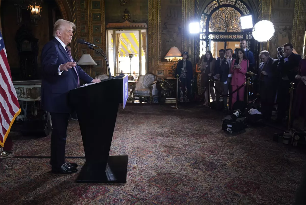 候任美國總統特朗普7日在佛州海湖莊園召開記者會,闡述未來4年政策。AP圖片