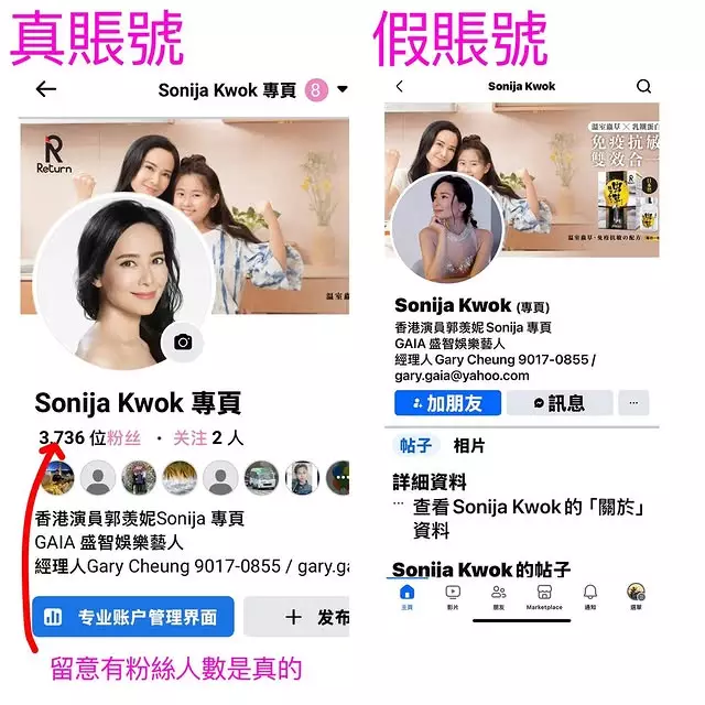 郭羡妮寫道:「近日發現本人的假Facebook 賬戶,並與本人之粉絲私信對話,我們已經即時向有關部門舉報為免大家受騙,請留意有可疑的賬戶,並切勿透露個人資料,有關假賬戶網址是: https://www.facebook.com/share/1DhaNZADXb/?mibextid=wwXIfr (會在Story 加上連結)請大家向Facebook舉報 識別本人真假Facebook賬戶,可從上圖見到,頭像已經有分別(當然假戶口也可以改變)。而最主要分別是,真賬戶暫時之粉絲人數有3,700+。大家如果有問,歡迎於經理人公司 @gaia_entertainment聯絡! @sonijakk #郭羡妮 @gaia_entertainment」