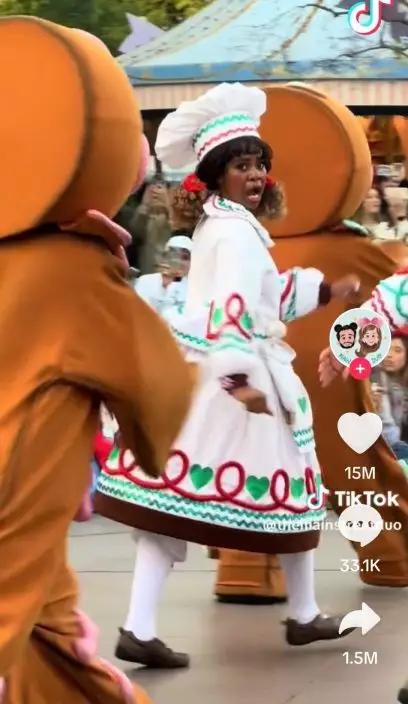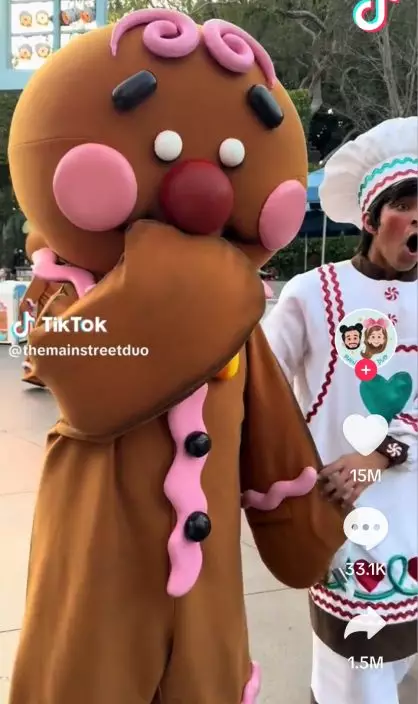 綜合外媒報導,國外社交平台近來瘋傳一段逗趣片段,事發地點疑為美國加州(California)迪士尼樂園。影片中,一名女遊客手上捧著1塊「薑餅人」餅乾,頭飾和上衣同樣是薑餅人主題,似乎相當喜愛該角色。隨後,她趁大批薑餅人巡遊演出時,趁機在薑餅人的角色面前咬下一大口薑餅人餅乾,嚇到薑餅人當場「吃手手」。