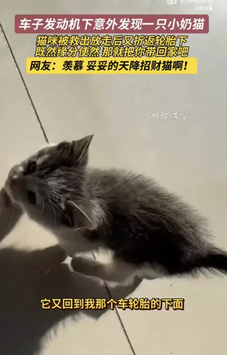 令遲女士沒有想到地是,流浪小貓不久後竟然又回到了愛車旁邊,一度蹲在車輪附近不肯離開。看見這樣的情況後,她無法再拒絕小貓的「收編要求」,認為這或許是「緣分」,因此決定將小貓帶回家成為一名新手貓奴。