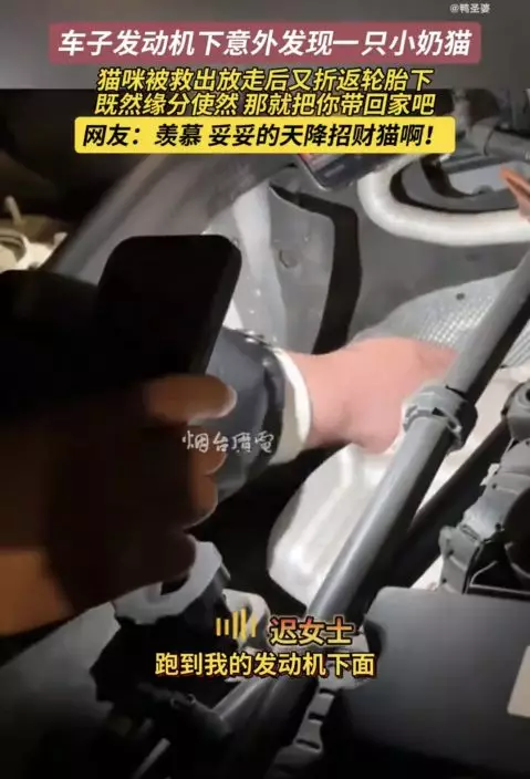綜合內媒報導,山東煙台一名遲姓女子日前準備駕車出門時,突然聽見引擎蓋傳出貓叫聲。由於網絡有宣導說開車前要先敲敲引擎蓋,因為天氣寒冷時,流浪動物極有可能躲進車內取暖。