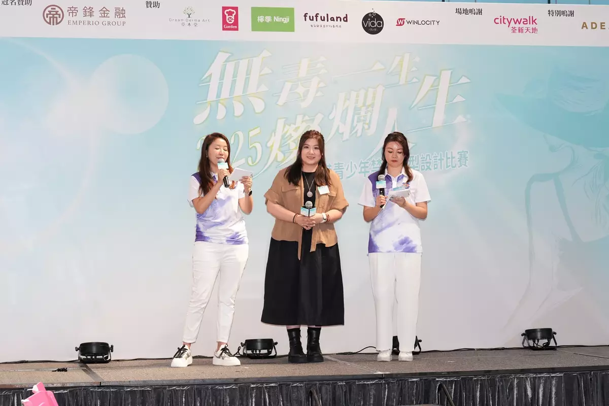 Kellyjackie、曹敏寶和邱芷微一同欣賞《無毒一生,燦爛人生2025》全港青少年造型設計比賽。