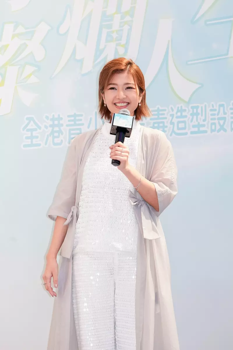 邱芷微(賈名媛) 當日興奮獲LuLu Cheung挑選穿上對方設計服裝現身,「套衫好閃,我專登襯埋其他閃閃鞋同飾物出嚟,如果吸毒就會冇晒儀態,仲點着到咁靚嘅衫呀!」