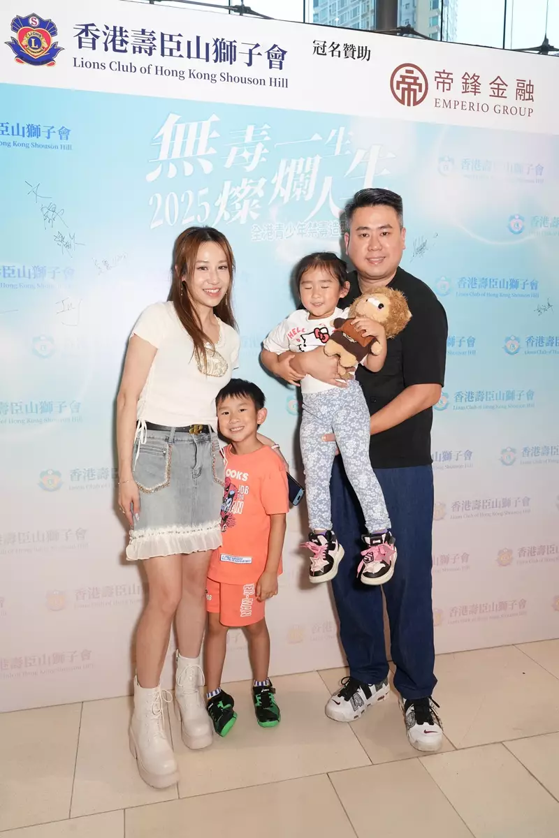曹敏寶全家來支持,作為分別6歲的囝囝和3歲囡囡的媽咪,看到近期吸食毒品的年紀愈來愈細,感到相當擔心,「作為家長真係好驚,我有個姪女都係得12、3歲,佢話都見到有好多朋友吸太空油毒品,首先唔知佢哋點解會買到,最擔心係佢哋太細個,根本唔知道禍害嘅層面,呢個責任就要交返畀大人,其實小朋友咁做離不開攞注意力,同埋就係冇抒發情緒嘅窗口,所以大人要主動去關注,同佢哋多啲傾偈了解有咩心事,面對緊咩困難,我成日講係用愛去浸大啲仔女,令佢哋唔敢做嘢傷害父母嘅事,諗起阿媽咁樣會傷心,佢哋就唔會做啦!」由於Mable一對子女年紀太小,更加要因材施教,對症下藥,「我會好簡單咁同佢哋解釋,有啲藥係好,幫到人醫病,但有啲藥係害人,令人更加病,所以有任何人叫佢哋食啲唔熟識嘅嘢,就要話畀媽咪聽,等佢哋有個安全意識先,我個仔開始懂事,佢又好貪靚,又鍾意做Super Hero,我就會話畀佢聽亂食嘢會做唔到Super Hero,飛唔到上天佢就會好驚。」