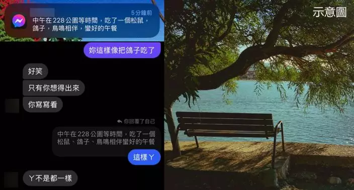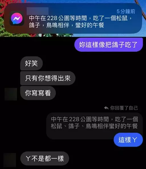 帖主隨後開玩笑回覆媽媽,「妳這樣像把鴿子也吃了」。媽媽看後要求帖主發送1個正確的說法,於是帖主稍為更改部分的標點符號,「中午在228公園等時間,吃了一個松鼠、鴿子、鳥鳴相伴蠻好的午餐」。沒想到,媽媽看後表示不認同,直呼「啊不是都一樣」。