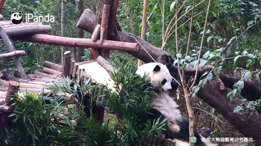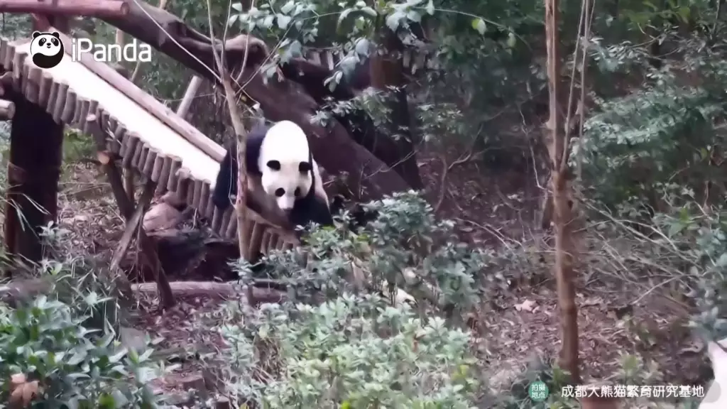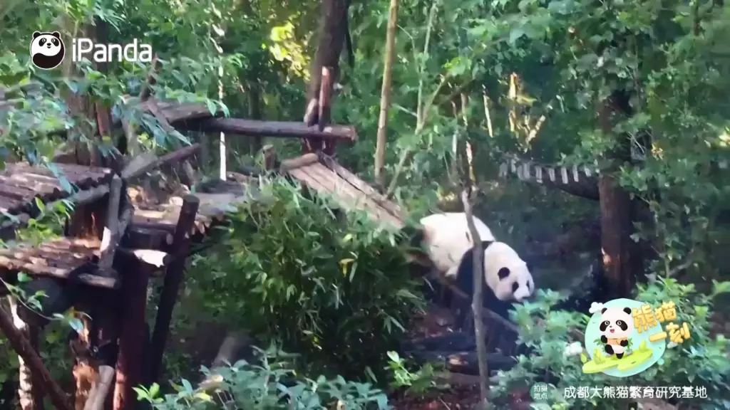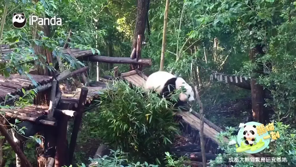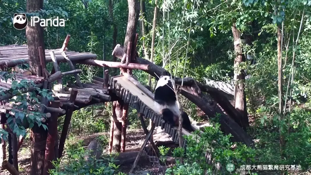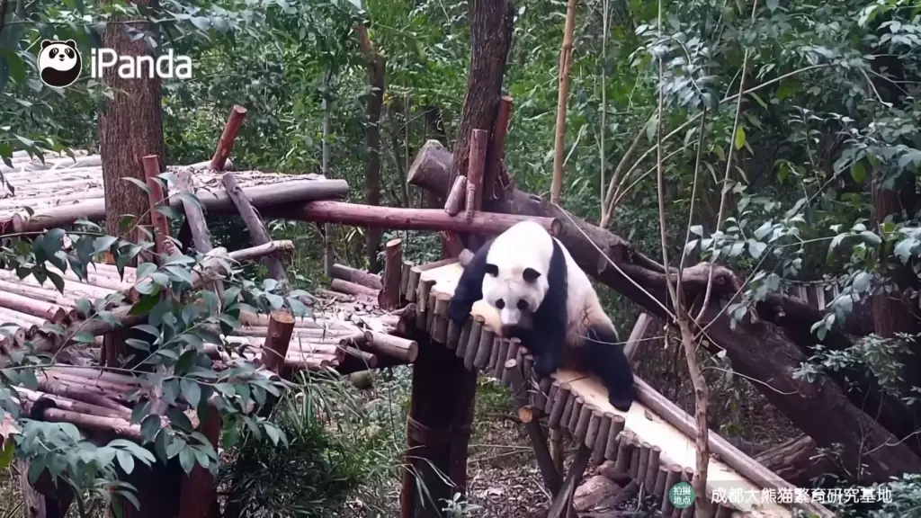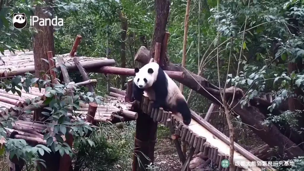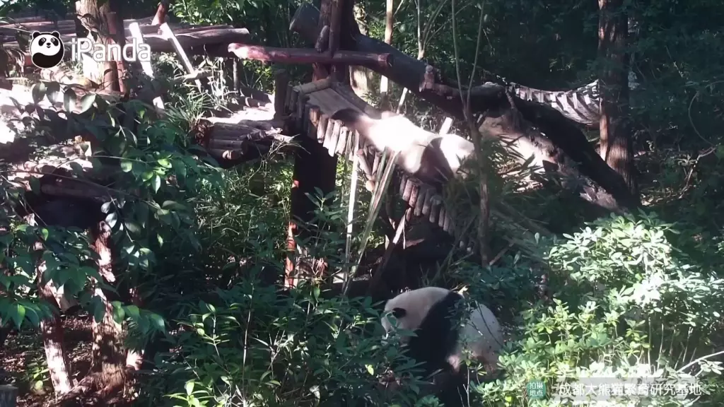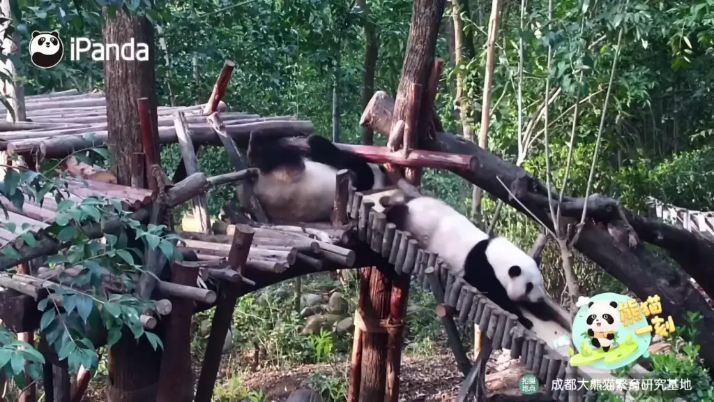 成都研究基地六號熊貓別墅中,雙胞胎大熊貓姐妹「和花」與「和葉」在飼養員專門設計的滑梯上滑行嬉戲,最喜歡冒險的姐姐「和花」被拍到趴著從斜坡上滑下來,而妹妹「和葉」則躺在附近的架子上,看起來很放鬆。