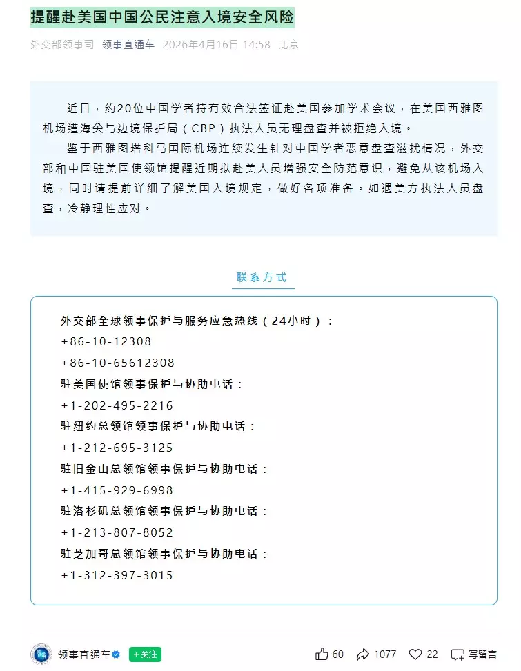 外交部領事司微信公眾號16日指出, 約20位中國學者近日持有效合法簽證赴美國參加學術會議,在美國西雅圖機場遭海關與邊境保護局(CBP)執法人員無理盤查並被拒絕入境。