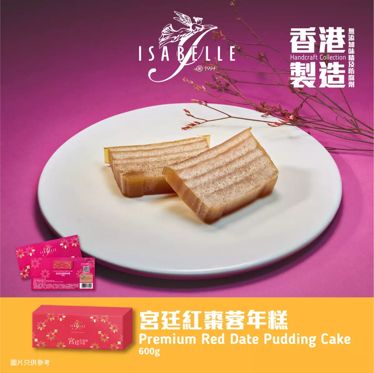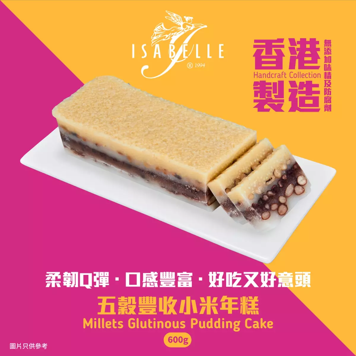 ISABELLE同時推出新春年糕禮券,多款口味包括新出的五穀豐收小米年糕、古法薑汁年糕、人氣的抹茶紅豆麻糬年糕、豐盛伯爵茶年糕,以及經典的櫻花蝦瑤柱蘿蔔糕及滋潤養顏,特別適合一眾女士的宮廷紅棗蓉年糕,款款真材實料,香港製造,送禮自用皆宜。現貨年糕已開售:蘿蔔糕由1月18日至31日供應;其他口味的年糕則由1月13日至31日供應,每盒$175;現貨可在K11期間限定店購買。