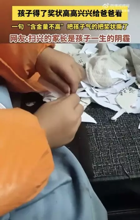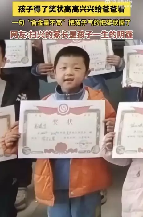 當天,男童爸爸來接他放學,男童迫不及待與爸爸分享自己獲得獎狀的消息。令人傻眼地是,爸爸不僅沒有表揚他,反而冷冷地回了一句「含金量不高」,因為這是全班同學幾乎都有的。這番話宛如一盆冷水澆淋在男童身上半,讓他備受打擊當場哭了出來,隨後將獲得的獎狀撕毀。