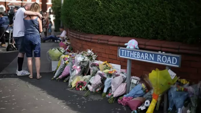 2024 年 7 月,人們在英國紹斯波特悼念持刀攻擊的受害者。