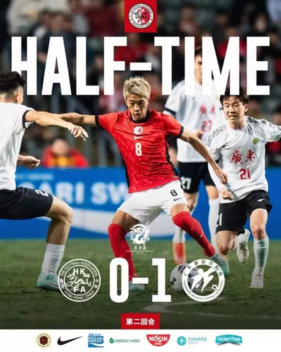 省港盃足球賽第二回合,港隊上半場0:1廣東隊,總比數1:2落後。