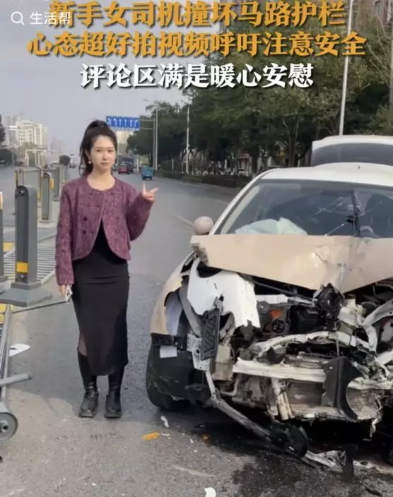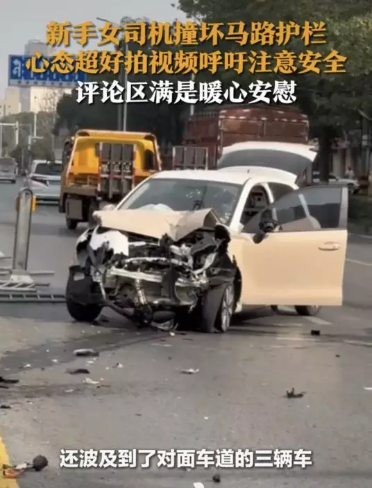 江西女車主駕車失控撞毀護欄後又連撞3車,隨後竟在車禍現場淡定比耶拍照,引網友兩極熱議。