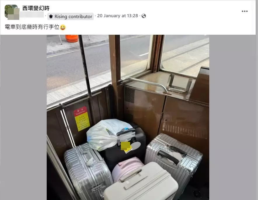 電車內部空間較為陝窄,多人時乘客往往都寸步難行,由車尾移至車頭下車更是談何容易。日前有網友在臉書群組以「電車到底幾時有行李位?」為題上載相片,相片所見在電車車尾上車的位置竟然放置了四個大行李喼及一個背包,令原本已空間不足的上車位,空間更陝小。