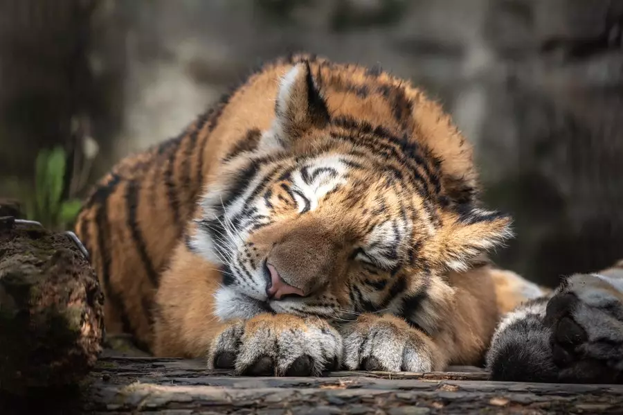 照片可見,老虎趴臥在地上,用雙爪枕著自己毛茸茸的頭部睡覺,只見牠睡著之後再也不見其兇猛氣勢,取而代之的是一張軟萌可愛的臉龐,令人倍感療癒。