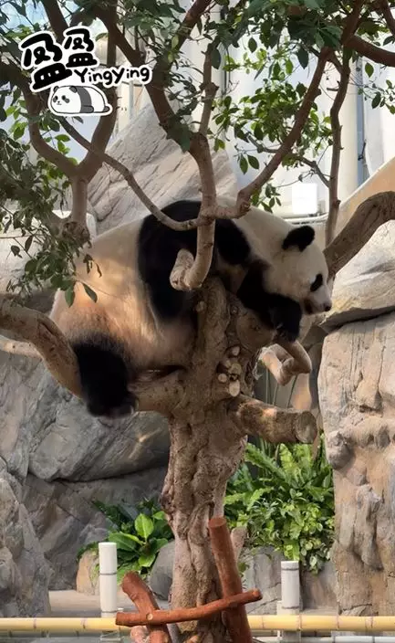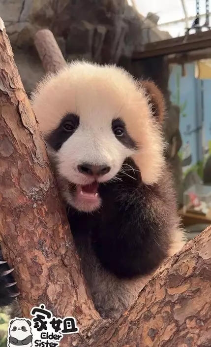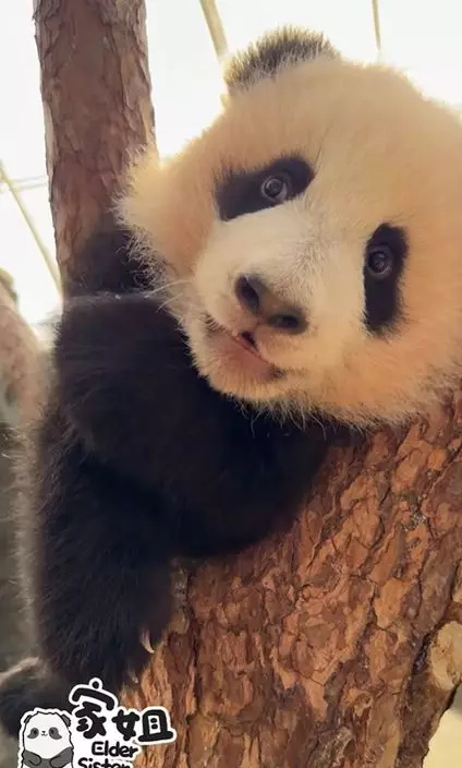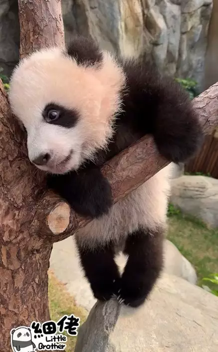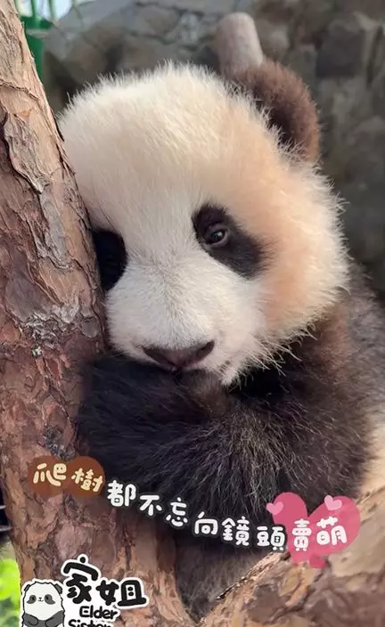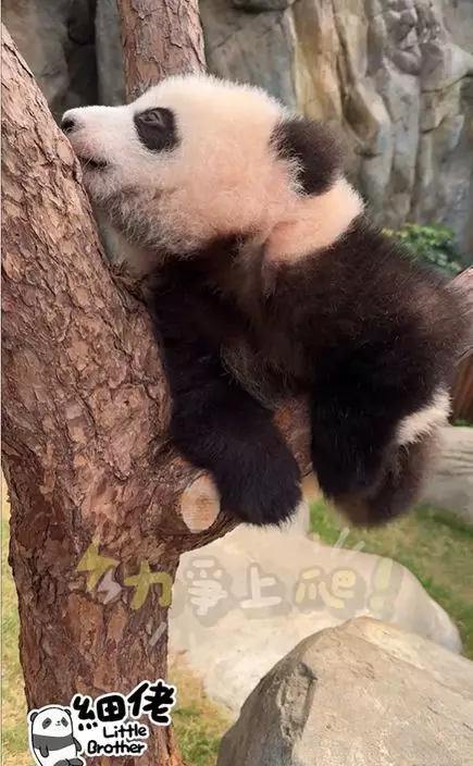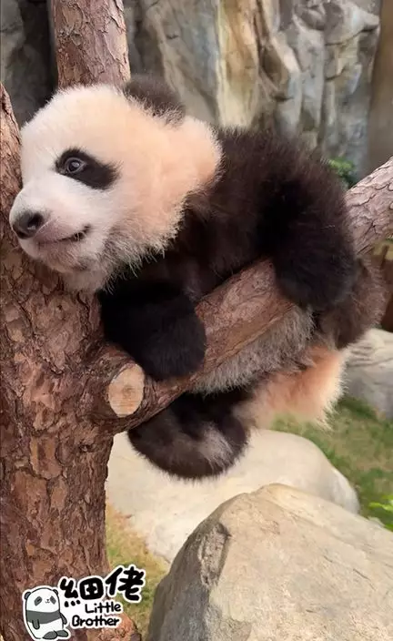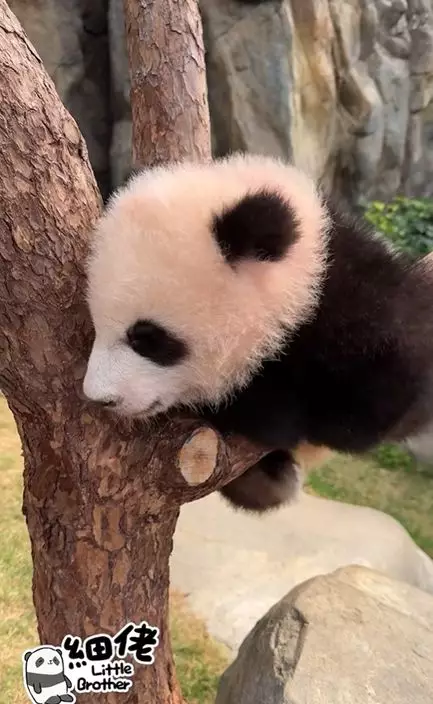 大熊貓家姐爬樹咬手指擺Pose賣萌 細佬四肢並用盡展「力的表現」網暈:可以出道了!