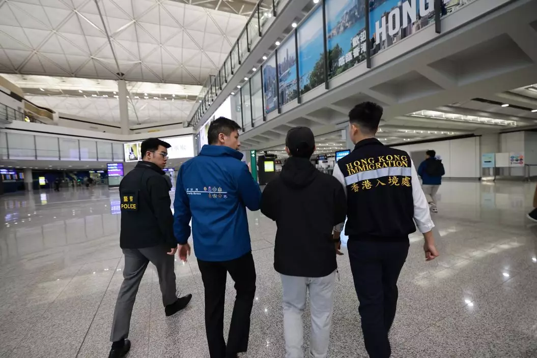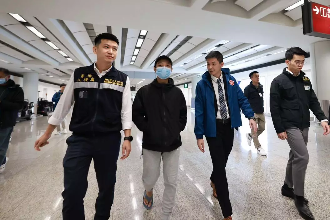 一名在緬甸被禁錮從事非法工作並獲救的男子,由泰國返港,他在保安局專責小組成員陪同下,抵達機場警署協助調查。