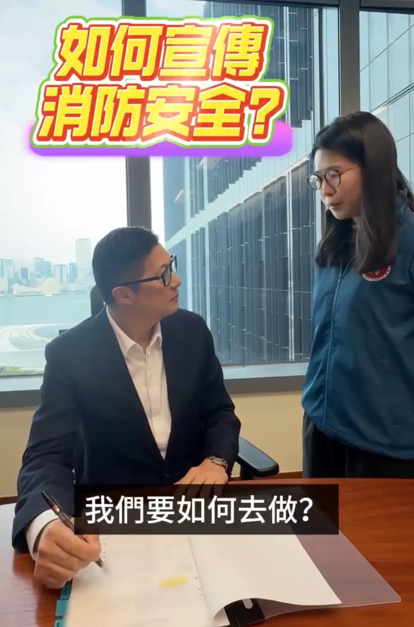 片段中,小編走到鄧炳強身邊問「局長局長,消防安全要做宣傳,我們點樣做好呢?」鄧炳強回答說﹕「搵人拍片囉﹗」