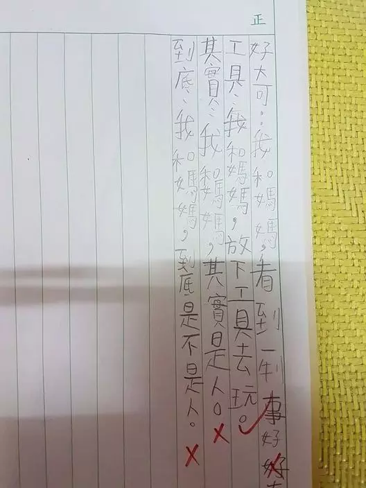 台灣有位媽媽網友在社交網站Facebook群組「爆廢公社」中,上載女兒練習造句的功課,其中一條題目是「到底」,想不到女兒居然寫下「我和媽媽,到底是不是人」,讓媽媽哭笑不得,直呼「我到底哪裡惹到她,囧rz」。除了「到底」外,其他造句也非常好笑。