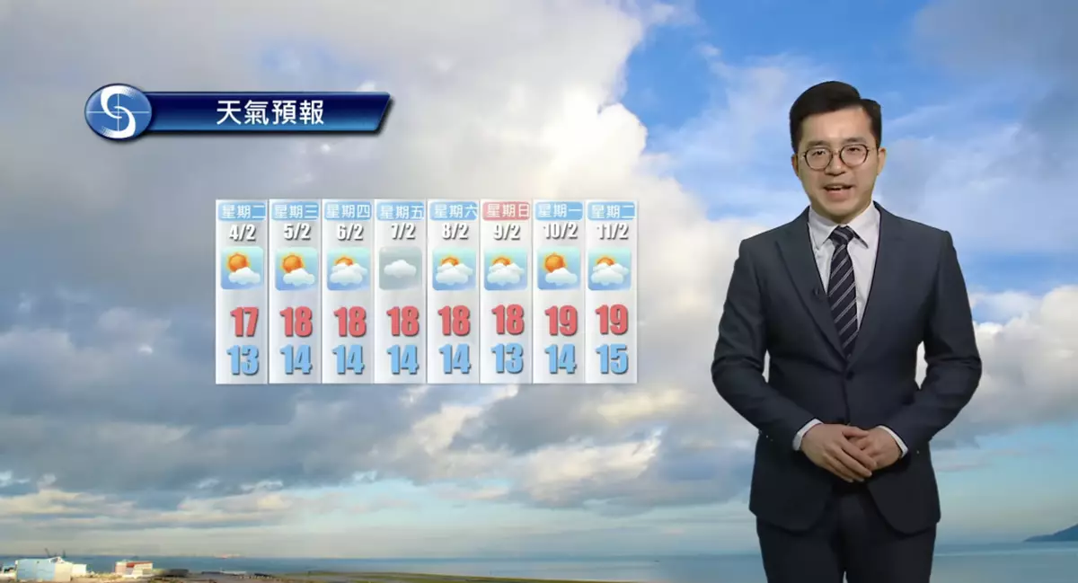 天文台表示,與冷鋒相關的東北季候風正逐漸影響廣東沿岸,周一早本港天氣轉涼,普遍地區氣溫較2日早上低兩、三度,預料日間氣溫徘徊在17度左右,稍後氣溫逐步下降至晚上市區最低約14度,新界再低一兩度。