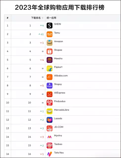 報告顯示,Temu、Amazon、Aliexpress分別位於2023購物類APP下載量第二位、第三位和第九位。