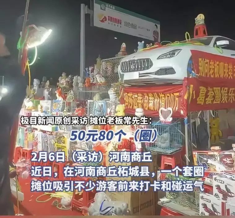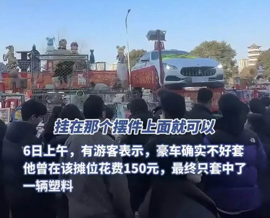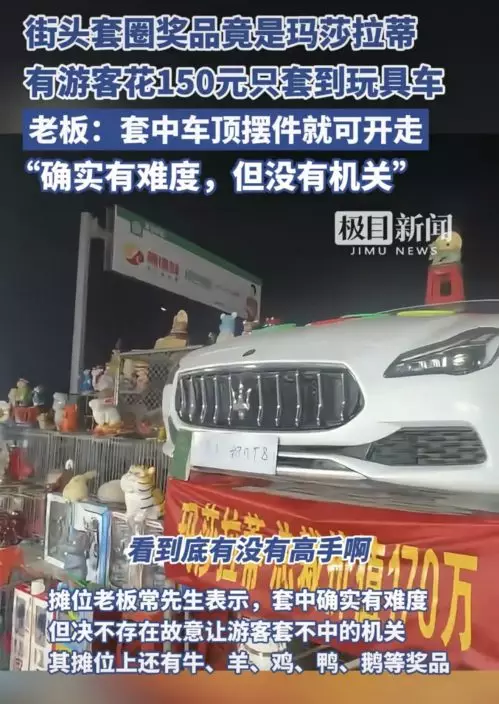 河南夜市套圈攤位老闆將一部「瑪莎拉蒂」二手豪車作為最大獎項,並霸氣喊話:套中即可開走,澄清沒有機關但確實有難度。