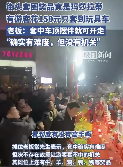 老闆對此也坦言,想要套中瑪莎拉蒂的確難度較大,但強調自己絕對沒有設置任何特殊機關來刻意阻止遊客獲勝,「只要圈掛在擺件上就行,這和技術和運氣有關」。