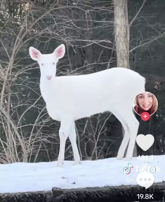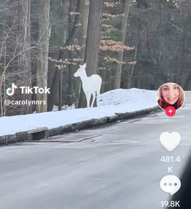 綜合外媒報導,國外一名女子「@carolynnrs」日前在TikTok上拍片分享,下班開車回家途中偶遇一隻罕見「白化鹿」的奇妙經歷,令她直呼不可思議,「牠看起來真的是太不可思議了,雖然全身是白的,可是從粉紅色的眼睛可看出應該是白化鹿,美到不真實」。